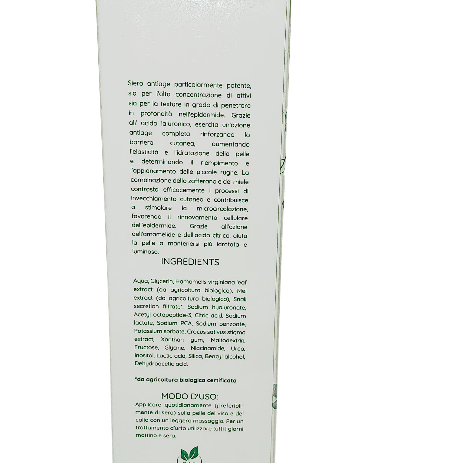Questo siero viso premium combina la potenza del PHYTALURONATE, stimolatore naturale della produzione di collagene, con vitamina E e olio d'oliva per contrastare i radicali liberi e restituire resistenza e tono alla pelle. L'aloe vera completa la formula, regalando una texture straordinariamente morbida e una superficie levigata. Ideale per chi ricerca risultati visibili e una pelle rigenerata, questo trattamento concentrato trasforma la tua routine di bellezza in un momento di lusso quotidiano. Prodotto in Italia. Spedizione gratuita in Italia per ordini superiori ai 50 eur anche sugli altri prodotti.